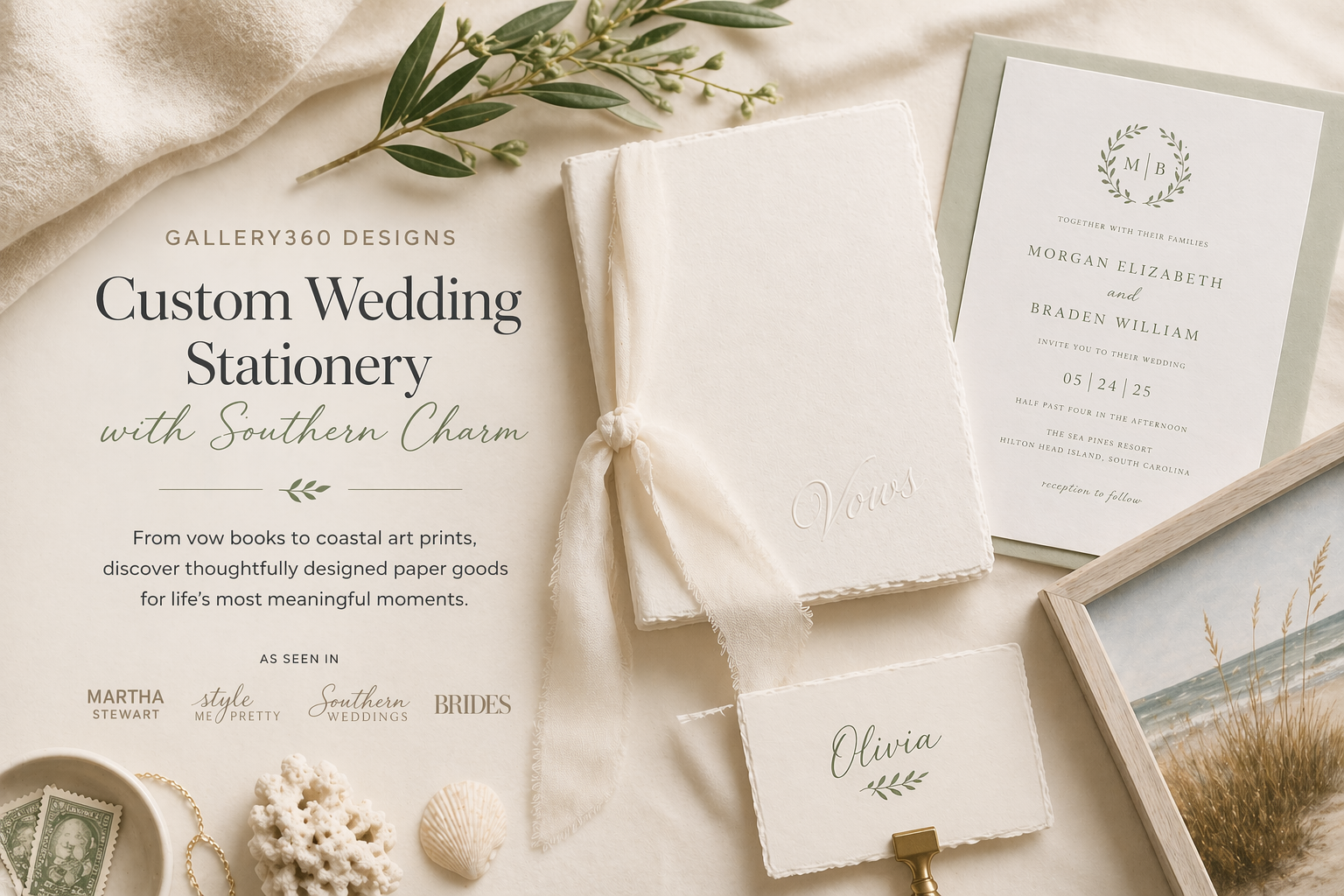 Gallery360 Designs creates thoughtfully designed paper goods for life’s most meaningful moments. Rooted in Southern charm and guided by modern simplicity, our collections include wedding day stationery, vow books, personalized stationery and coastal-inspired art.